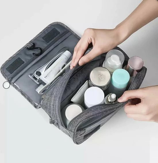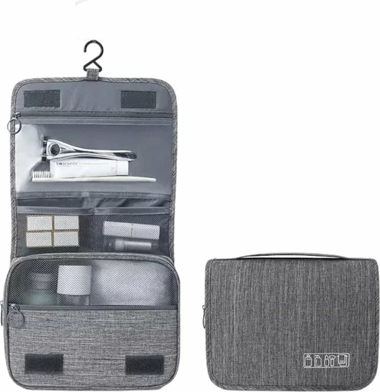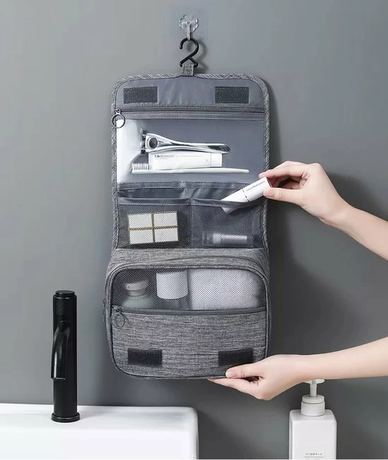 Het kunnen ophangen van je tas is een groot voordeel, omdat het soms niet mogelijk is om spullen op te bergen. Bovendien is een hangende toilettas handig, omdat je de toilettas als het ware uitrolt, waardoor je makkelijk bij je spullen komt.
