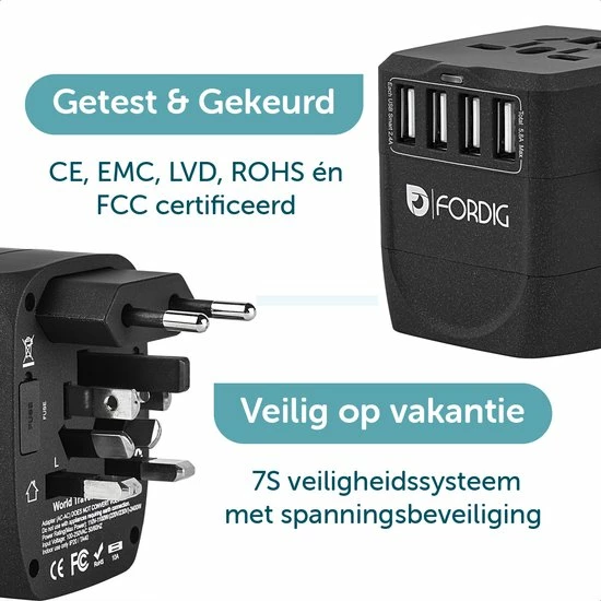 Je wilt natuurlijk niet de borg verliezen van je hotel of aan de huisbaas van je B&B uitleggen dat zijn appartement met de grond gelijk is gemaakt door een brandje vanwege jouw apparatuur. Daarom heeft de ForDig reisstekker een speciale smart chip met ingebouwde zekering, met het 7S beveiligingssysteem. Hierdoor heeft de adapter spanningsbeveiliging. Daarnaast is de stekker door een onafhankelijk bedrijf getest voor alle gevraagde eisen in diverse landen. Dit betekent dat de adapter het CE, EMC, LVD, ROHS én FCC certificaat heeft!