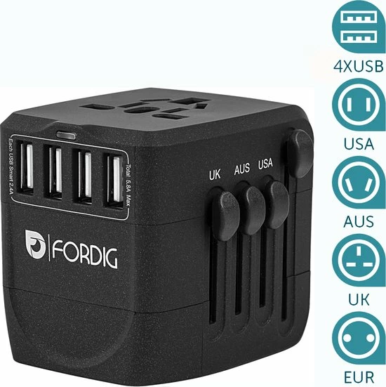 We hebben allemaal wel 2 keer per jaar 6 maanden vakantie nodig en als je gaat vergeet dan nooit je ForDig Reisstekker! Met de 4 Fast Charge poorten, 1 USB-C poort en het netstroom contact laad je tot wel 6 apparaten in een mum van tijd tegelijkertijd op. Om te zorgen dat je niet in de problemen komt bij de douane heeft de reisstekker alle benodigde certificaten en is zo veilig mee te nemen op reis naar wel meer dan 150 landen! Deze compacte travel adapter weegt in totaal maar 184 gram, genoeg kilo’s voor alle andere ‘essentiële’ reisbenodigdheden dus! Inclusief opbergzakje. Uiteraard is de wereldstekker voorzien van het nieuwste 7S veiligheidssysteem met spanningsbeveiliging. ForDig bestaat alleen met en voor jou, bestel vandaag nog!