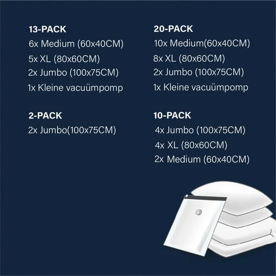 De vacuΓΌmzakken zijn vervaardigd van stevig plastic waardoor de opbergzakken helemaal vacuΓΌm blijven. Verder zijn de de zakken vochtbestendig en dankzij het stevige plastic zijn scheurtjes in de zakken verleden tijd. De 2-delige vacuΓΌm opbergzakken set wordt geleverd zonder een klein handpompje. Wij raden aan een stofzuiger te gebruiken voor de XL vacuΓΌm opbergzakken aangezien dit een stuk sneller gaat.