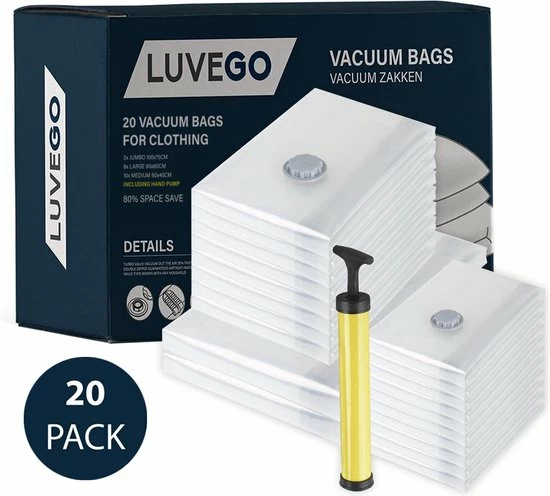 Of je nu ruimte wilt besparen in je koffer, meer plek wilt in je kledingkast of die enorme knuffels van je kinderen wilt opbergen, de vacuüm opbergzakken van Luvego zijn dé oplossing. Deze vacuüm opbergzakken set bestaande uit 20 vacuümzakken inclusief handpomp bevat zakken in verschillende maten van klein tot XL zakken.