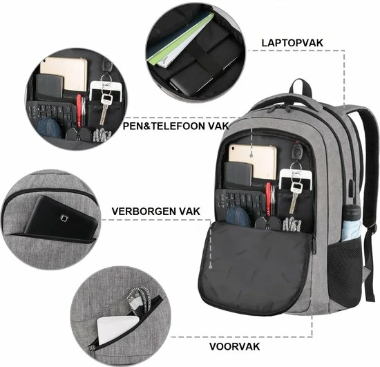 De stevige rugtas heeft een apart laptopvak voor een iPad, laptop (formaat tot 17,3 inch), portemonnee, kleding, flessen, telefoonaccessoires, paraplu en diverse items. Door de verschillende vakken zijn je items georganiseerd en makkelijk te vinden.