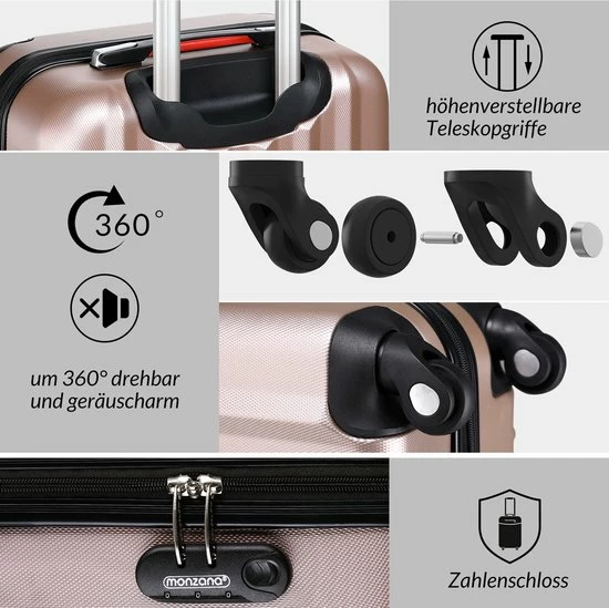 Een hoge duurzaamheid en een laag gewicht zijn de onderscheidende kenmerken van deze koffers. Met de 4 rubberen wielen (360Β° draaibaar), robuuste telescopische handgrepen en de gevormde handgrepen (boven- en zijkant) kunnen de koffers comfortabel worden verplaatst.