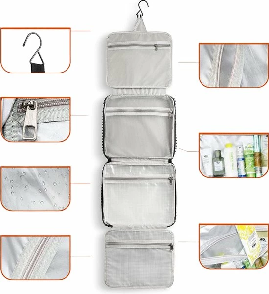 Deze waterafstotende toilettas is voorzien van een handige ophanghaak waarmee je de toilettas eenvoudig overal kunt ophangen. De toilet tas is gemaakt van stevig, waterafstotend nylon en is voorzien van stevige ritssluitingen. Hierdoor hoef je je nooit zorgen te maken over de inhoud van je toilettas: je toilet spullen zullen dus altijd droog blijven !.