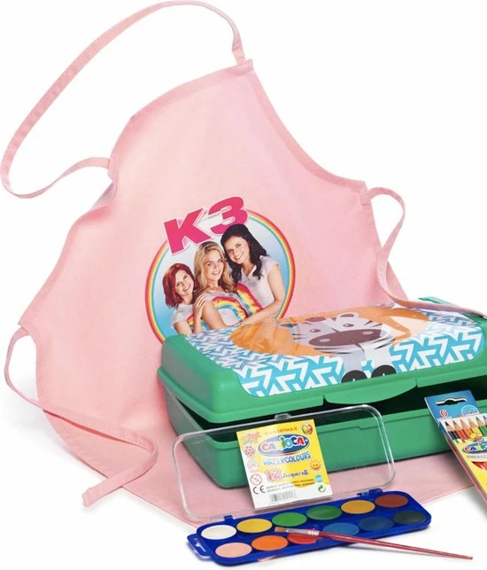 Wat dacht je van dit handige opbergboxje vol leuks: springtouw, springrekker, CARIOCA waterverf (12 noppen), CARIOCA kleurpotloden (6 stuks), kleurboekje in meisjesthema en een K3-short.
