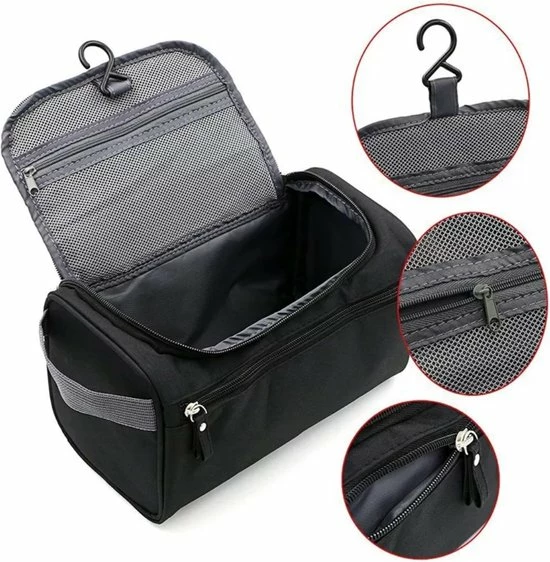 Aan de toilettas zit een stevige kunststof ophang haak. Daarmee kun je je toilettas overal makkelijk ophangen; In de douchehokjes, bij de wastafel of gewoon in je hotelkamer, tent of caravan.