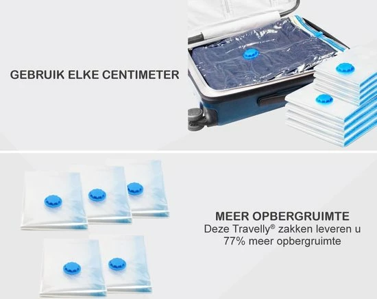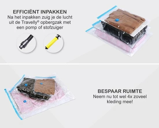 Met onze TRAVELLY vacuüm opbergzakken heeft u in een mum van tijd zeeën van ruimte gecreëerd in uw koffer, kledingkast of opbergruimte. Onze opbergzakken zijn luchtdicht, waterdicht, herbruikbaar en van extra sterk materiaal. De lucht word uit de opbergzak gezogen (doormiddel van een pomp of stofzuiger) waardoor uw opslagruimte tot wel drie keer groter wordt! Door de hoge kwaliteit plastic wordt de inhoudt optimaal beschermt tegen vieze geuren, schimmel en stof. (als de inhoud schoon is voordat het erin word gestopt)