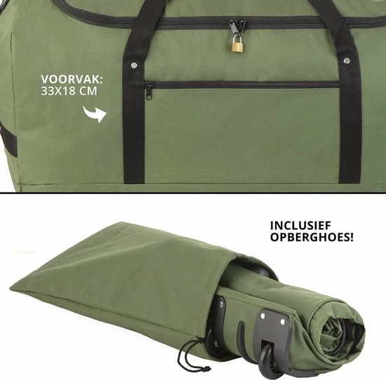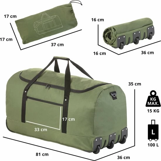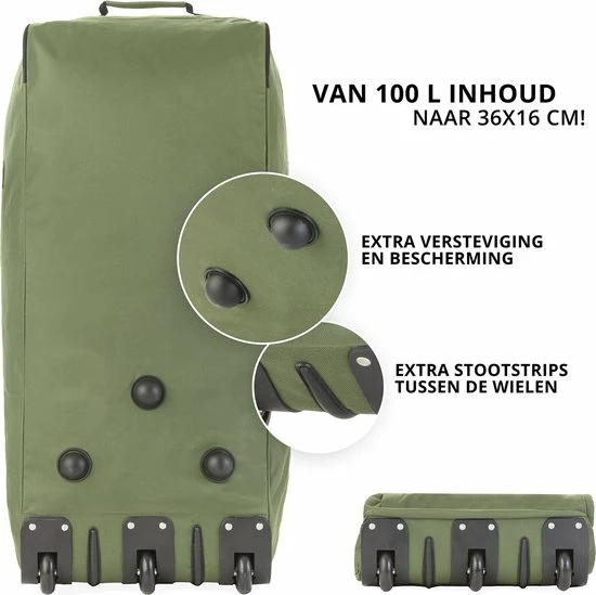 De opvouwbare tas wordt in een net tasje geleverd, waarin je deze weer opgerold in kunt opbergen. Slechts 17 x 17 x 45cm. Uitgerold is de tas 36 x 35 x 81cm. 100 liter moet voldoende ruimte geven voor de reis. Houdt er wel rekening mee dat tassen gevoeliger zijn voor scherpe randen tijdens transport.