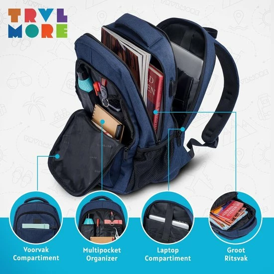 Snel en eenvoudig je laptop, boeken, powerbank, drinkfles en etui inpakken? Check. Begin het nieuwe schooljaar goed met de Schooltas van TRVLMORE. Zo kan je een laptop tot wel 15,6 inch kwijt in de schooltas en heb je nog voldoende ruimte over voor alle andere schoolartikelen. Eenvoudig je telefoon of laptop opladen via een powerbank? Geen probleem. Sluit je telefoon of laptop met een USB-kabel aan op de USB-uitgang aan de zijkant van de tas. Hierdoor kan de powerbank gewoon in de tas blijven zitten.