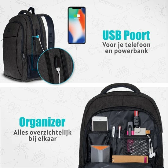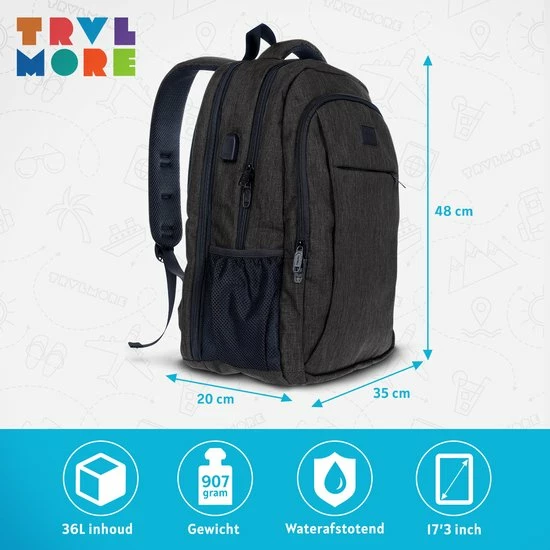 Zoek je een rugzak waar je 17,3โ laptop in past, die lekker zit en extra veel ruimte heeft? Dan is de TRVLMORE Rugzak XL (36L) voor jou! Met een spatwaterdichte coating, USB-poort, stevige vergrendelbare ritsen, en een 17,3โ laptopvak heeft deze tas alle features die je maar nodig kan hebben. De gewatteerde schouderbanden zorgen voor optimaal comfort. Tevens is de tas douane-vriendelijk. Deze stijlvolle en minimalistische 36 liter rugzak met verschillende opbergvakjes is ideaal voor dagelijks gebruik en voor op reis!