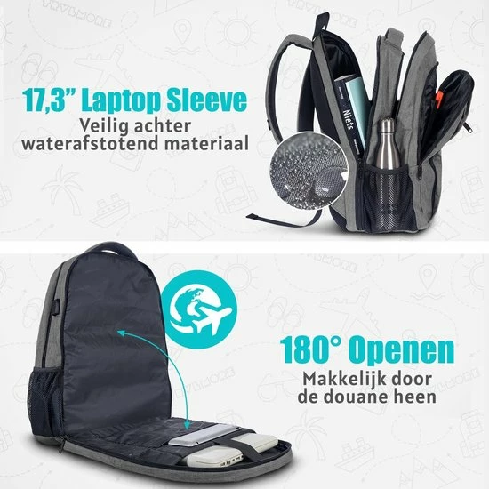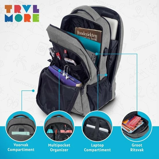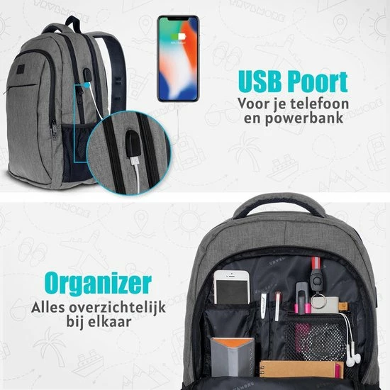 Zoek je een rugzak waar je 17,3โ laptop in past, die lekker zit en extra veel ruimte heeft? Dan is de TravelMore Rugzak XL (36L) voor jou! Met een spatwaterdichte coating, USB-poort, stevige vergrendelbare ritsen, en een 17,3โ laptopvak heeft deze tas alle features die je maar nodig kan hebben. De gewatteerde schouderbanden zorgen voor optimaal comfort. Tevens is de tas douane-vriendelijk. Deze stijlvolle en minimalistische 36 liter rugzak met verschillende opbergvakjes is ideaal voor dagelijks gebruik en voor op reis!