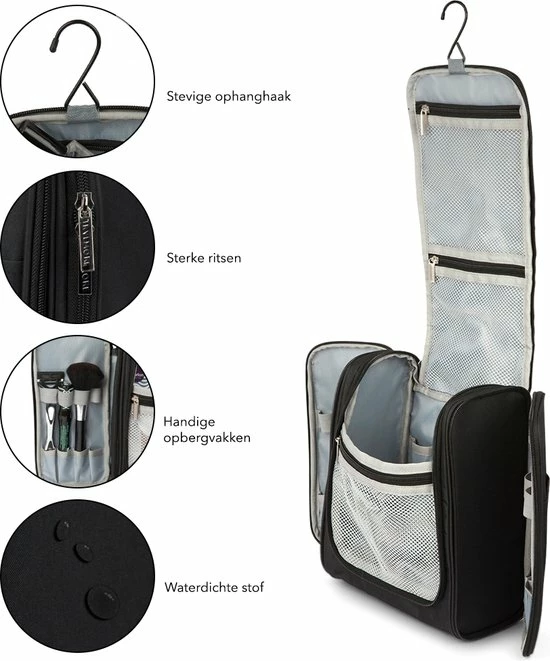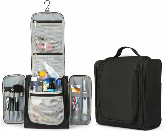 Met de ophanghaak in het hoofdcompartiment kun je de toilettas ophangen waar en wanneer je maar wil. Dit is ideaal voor bijvoorbeeld op de camping, kamperen of backpacken. Uiteraard kun je de stevige tas ook gewoon neerzetten in de badkamer.