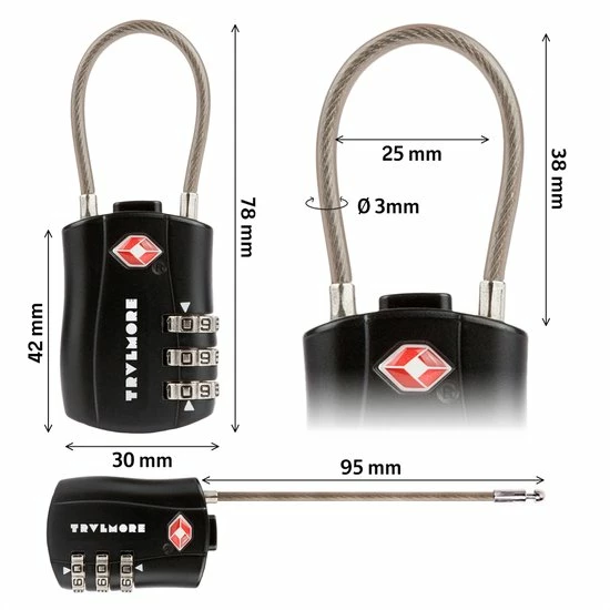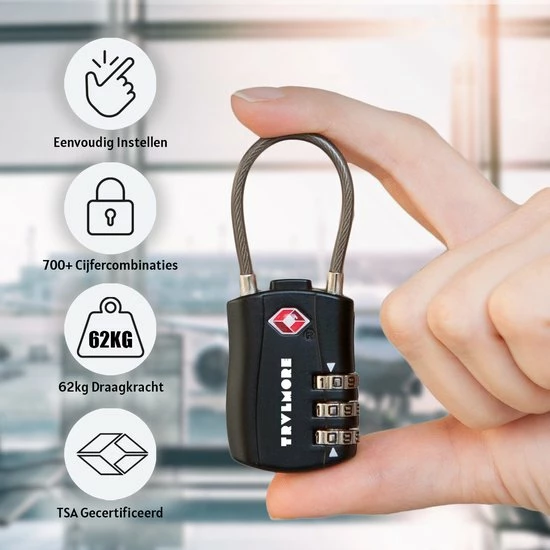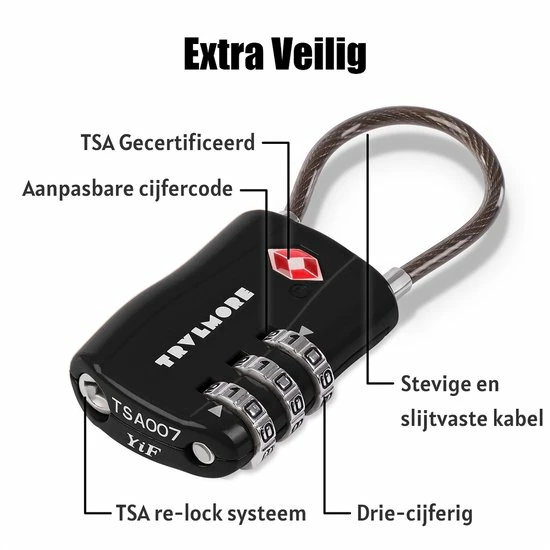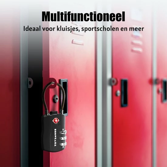Het kabelslot beschikt over een 3-cijferige persoonlijke pincode die u zelf gemakkelijk kunt invoeren met behulp van de bijgeleverde instructie. De cijfers van het slot zijn makkelijk leesbaar en slijtvast. Het kabelslot is geschikt voor TSA inspectie door Amerikaanse veiligheidsagenten en heeft een TSA certificaat. Dit kabelslot biedt beveiliging voor uw koffer en bagage op reis en is getest door duizenden tevreden reizigers.