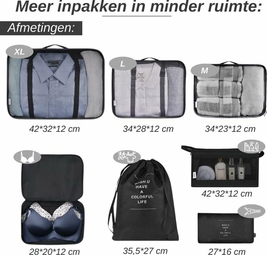 Breng het inpakken voor vakanties, trips, of outdoor activiteiten naar het volgende level. Gebruik de variΓ«rende maten packing cubes voor verschillende soorten kleding en behoudt overzicht. Bespaar tijd tijdens het reizen door te voorkomen dat items verkeerd ingepakt worden en krijg extra bagageruimte door volledig gebruik te maken van de ruimte in de koffer of tas. De set is geschikt als koffer en backpack organizer en kan ook los gedragen worden door de handvaten.