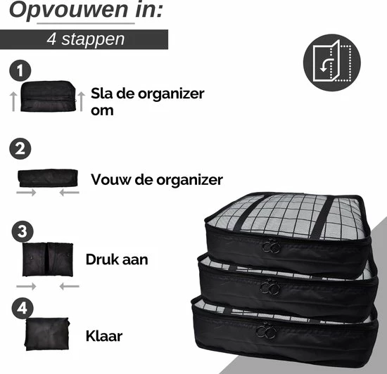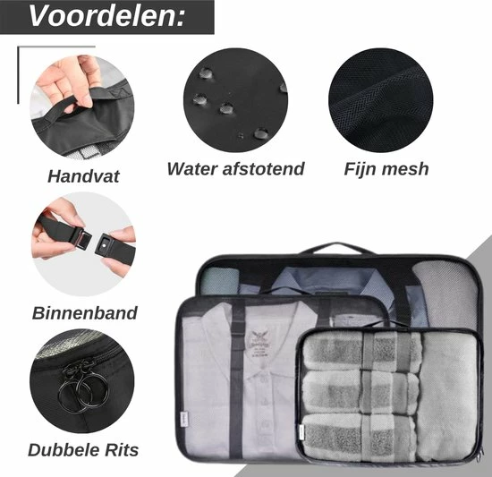 Ga georganiseerd op reis en bespaar kostbare ruimte met het gebruik van deze handige koffer organizer set. De packing cubes zijn vervaardigd uit waterafstotende en goed beschermende stof dat geeft extra gewicht toevoegt. De bagage organizers / travel cubes dienen als kleding organizer en houden je kleding schoon, gestreken en veilig tijdens het reizen.