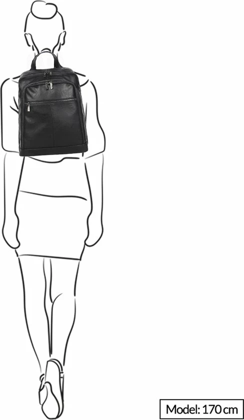 Op de voorzijde van de tas zitten 2 ruime ritsvakken. Op de achterzijde zit ook een ritsvak. Aan de bovenzijde zit een handvat waarmee je de rugtas makkelijk en snel op kunt pakken. Middels de twee verstelbare schouderbanden is de rugtas comfortabel op de rug te dragen.